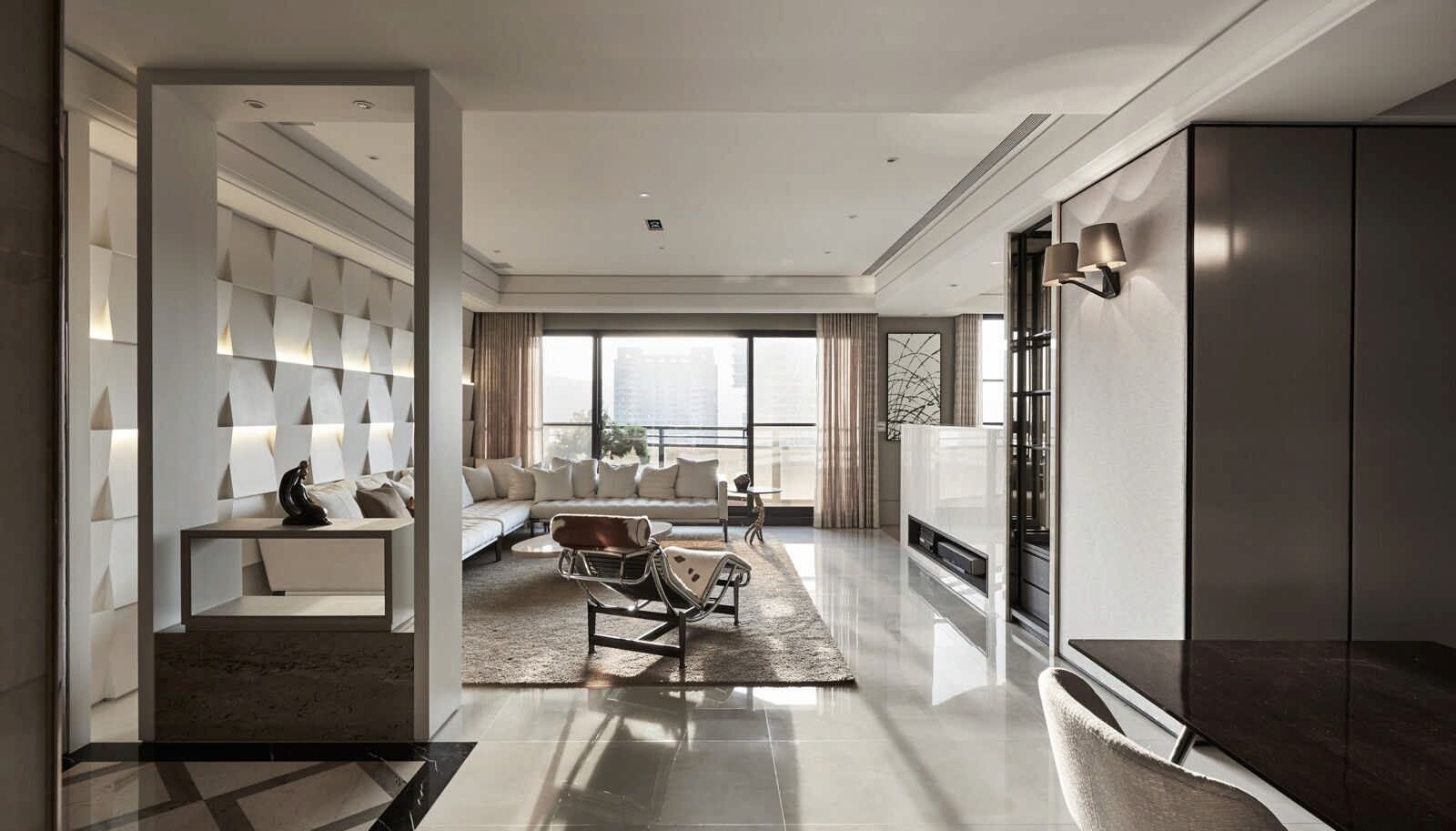 整體色調以潔白的環保塗料,搭配冷暖質地的防火布料材質,透光玻璃、留白鏡面、燈光及溫潤石材,讓居室在裡外的空間的介地中,透過光與景抒發反映光的變化線條,益於居室節能,引光及通風柔和的彼此互襯。