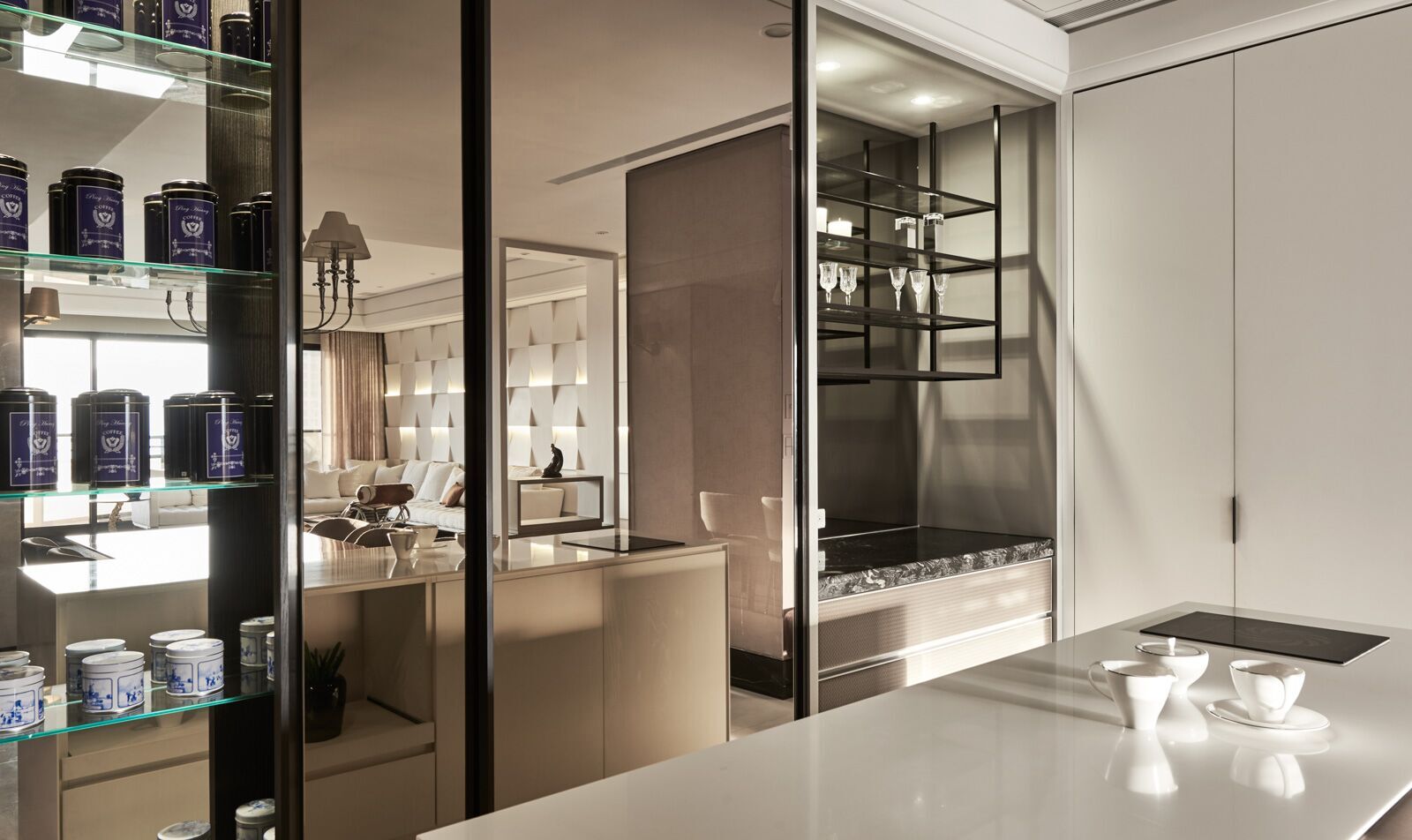並特別設計放置茶品及杯具的層架櫃體,貼近屋主需求的設計及兼顧空間的格局規劃,打造一段愉快美好的餐廚時光。