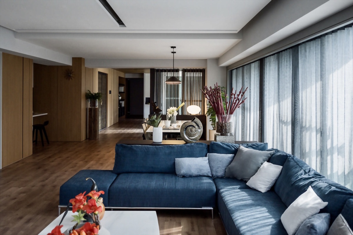客廳空間設計以沉穩的深藍色軟裝點綴空間色彩,給人獨具一格的住家設計品味搭配。