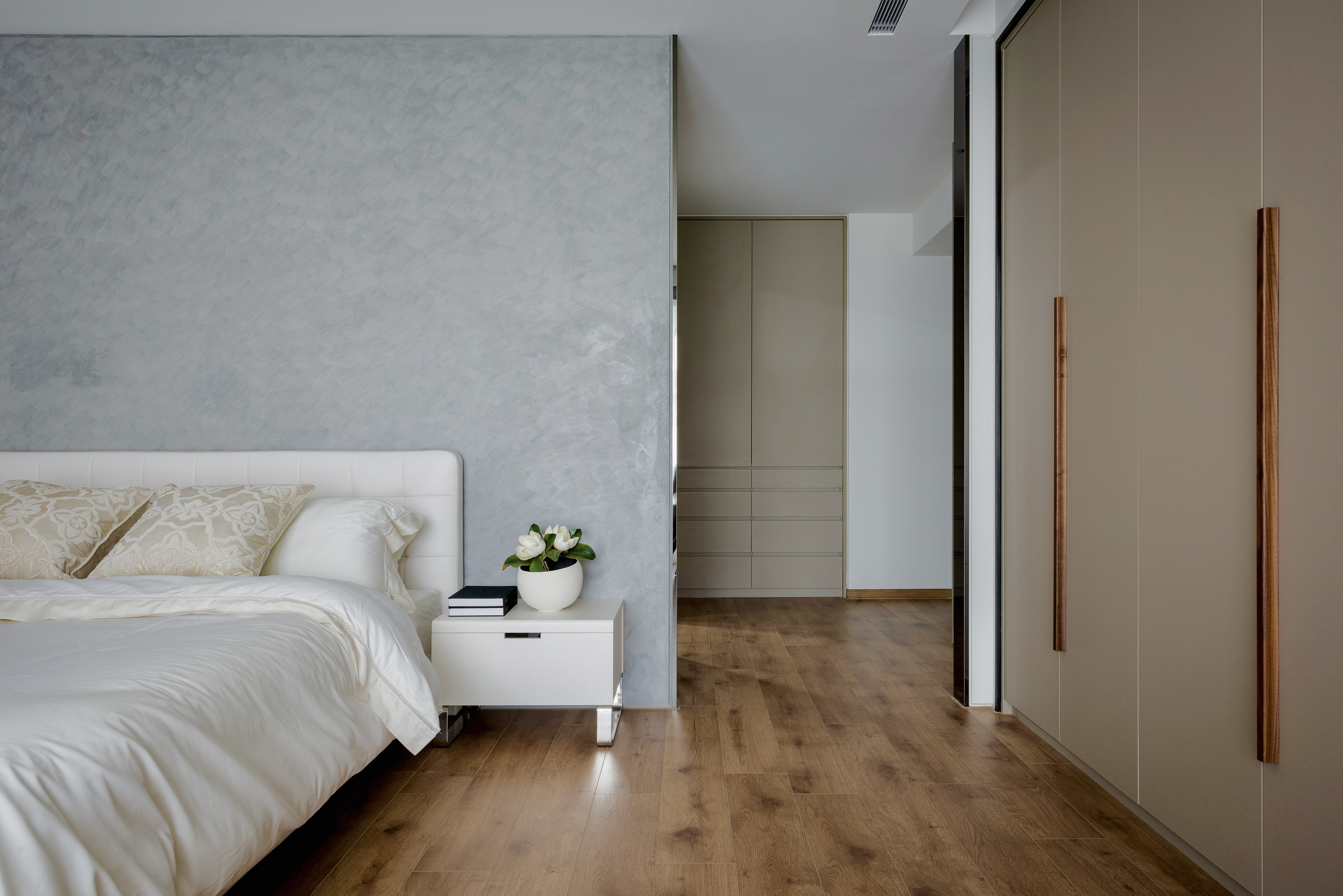 以大地色系為裝潢設計主要基調,搭配以特殊漆料呈現的臥室主牆,給人靜謐低調、寧靜浪漫優雅的深邃之感,低調優雅的裝潢風格室內設計重新定義對奢華生活的理解,處處透露出生活的溫馨。