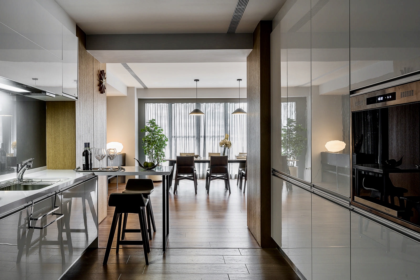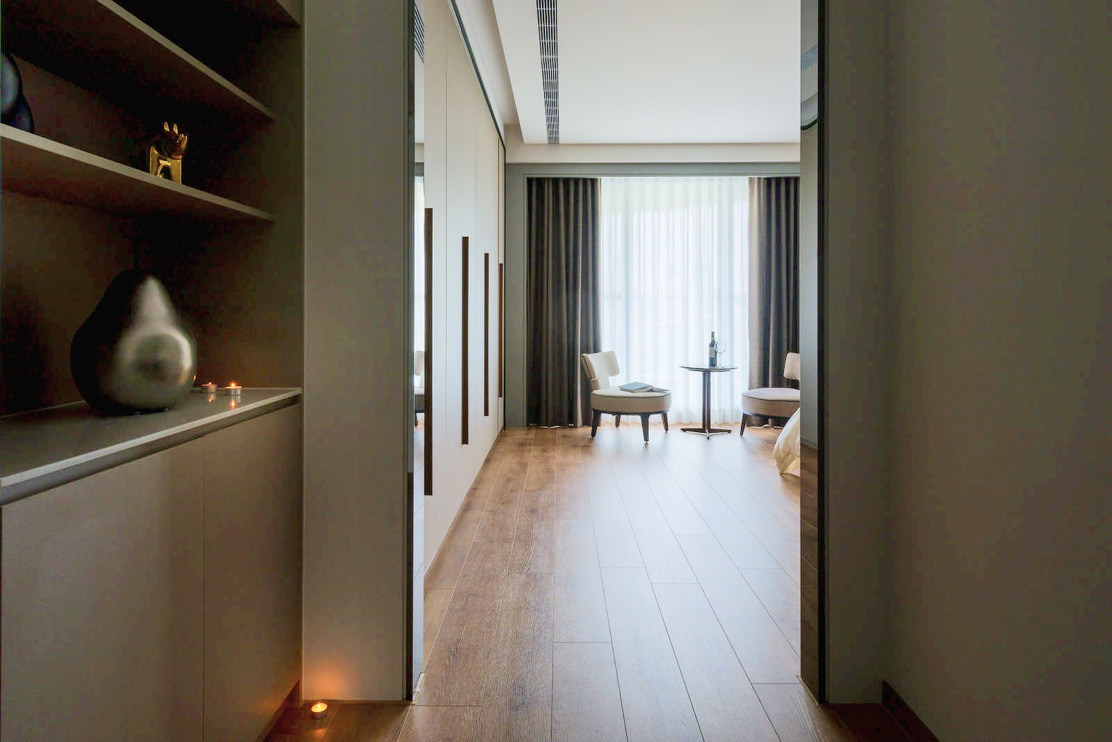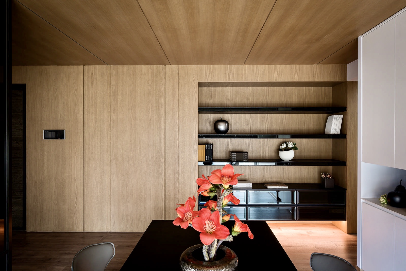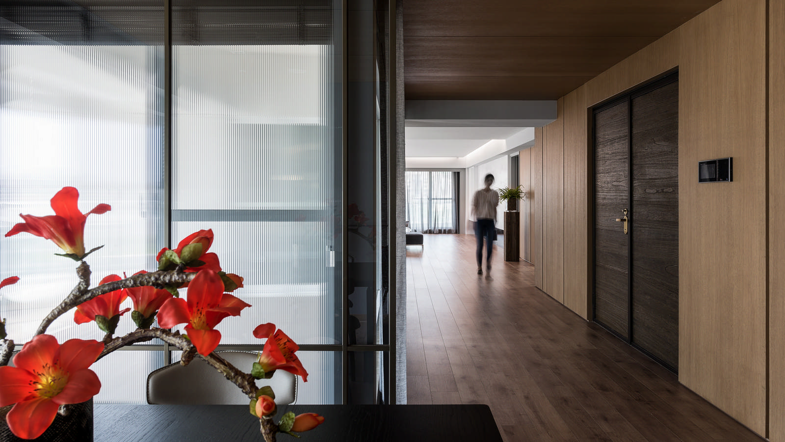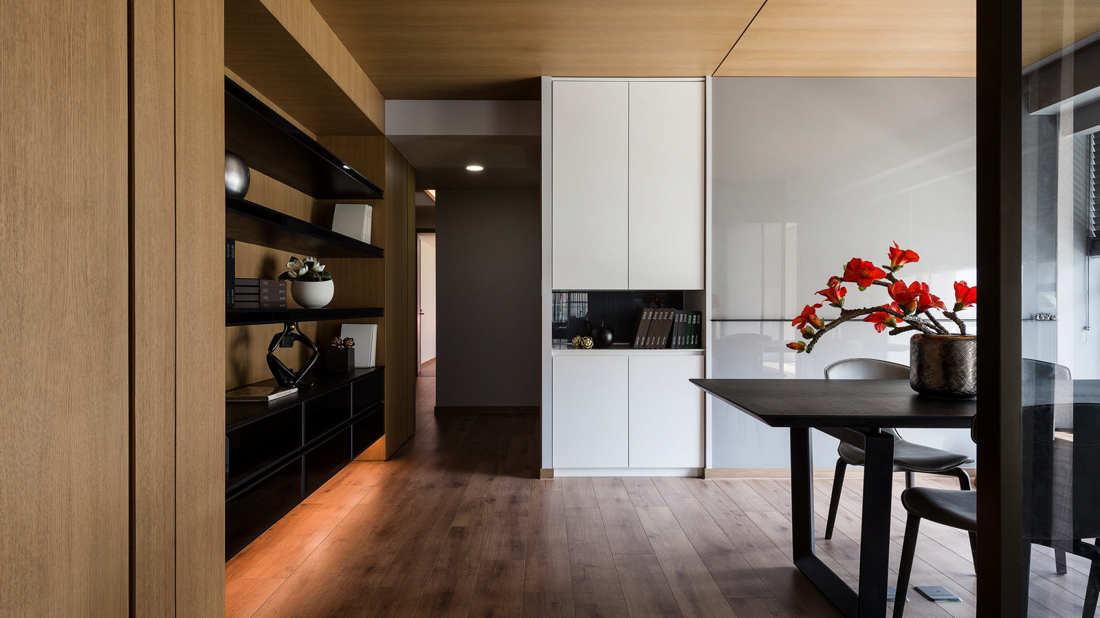 大量的光線卻以柔和的方式進入室內,與溫暖木質地板的空間,融合成舒適的居家空間,顯現出室內空間設計層層堆疊的柔和細節。
