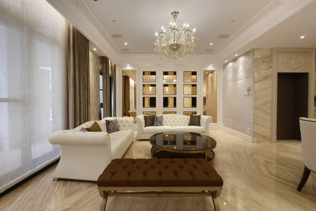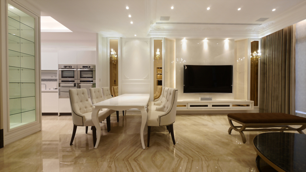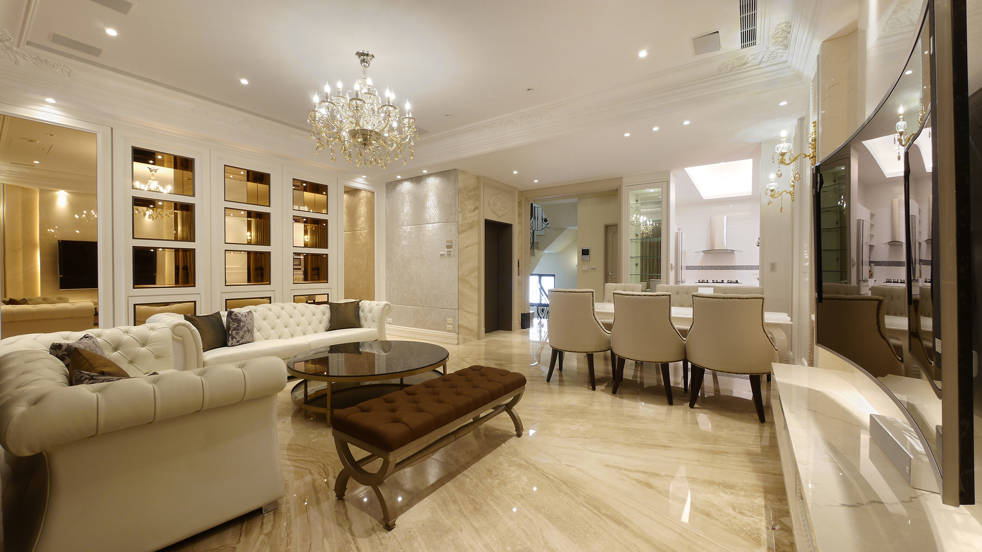 持續延用了米色精緻的大理石,大面積的覆蓋在2樓公區,素色線板雕刻的天花板,點綴以奢華晶亮的水晶吊燈,餐廳設計也在這個區域完美融合。
