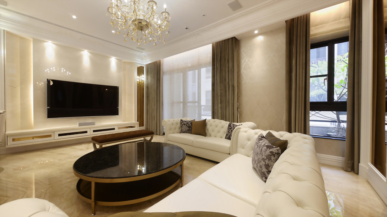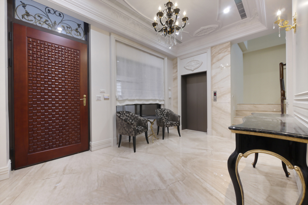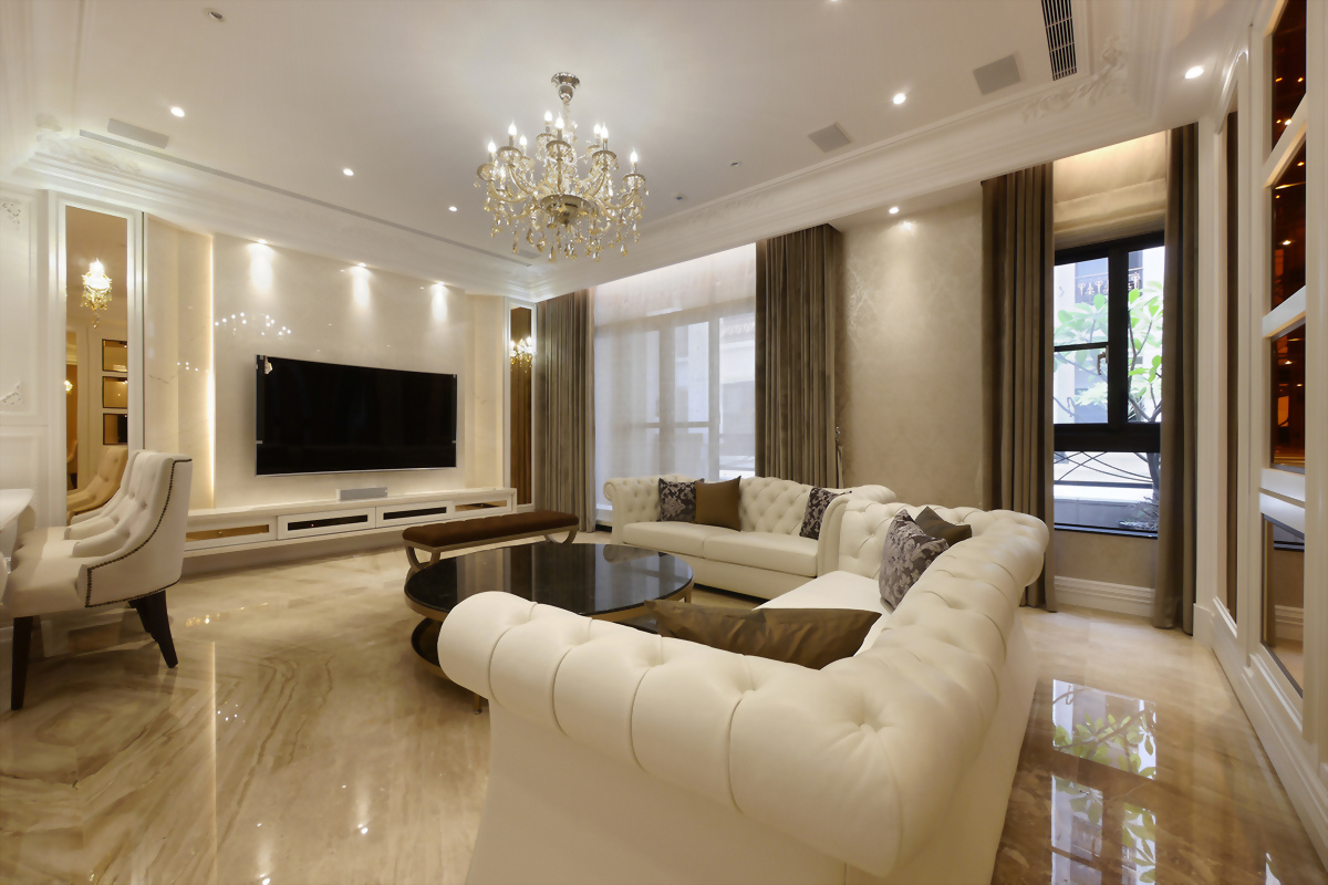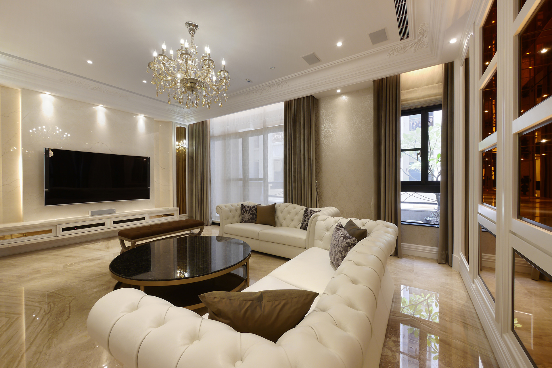 持續延用了米色精緻的大理石,大面積的覆蓋在2樓公區,素色線板雕刻的天花板,點綴以奢華晶亮的水晶吊燈,餐廳設計也在這個區域完美融合。