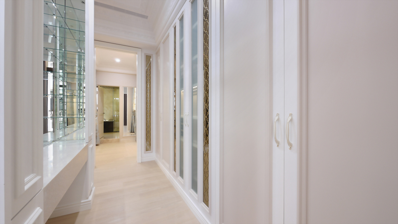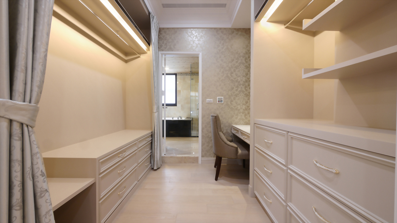 除了鞋、包、精品等收納是基本,晶透的香水櫃,皇室典雅的化妝桌椅,不管是開放衣櫃還是獨立空間,在許多細節處都選用溫柔又精緻的頂級材料及手工,如奢華的銅鏡面雕刻與皮革包覆的衣櫃門片,以及噴漆工法等等……才能真正呈現細節完美之處。