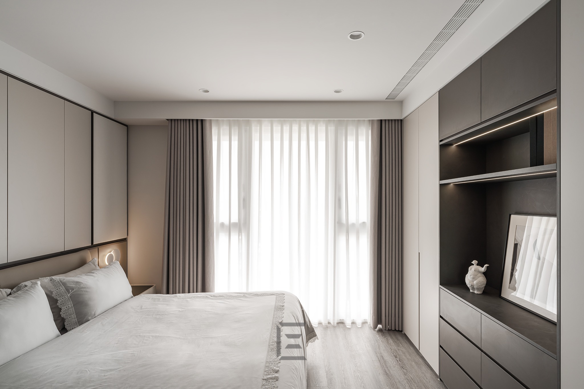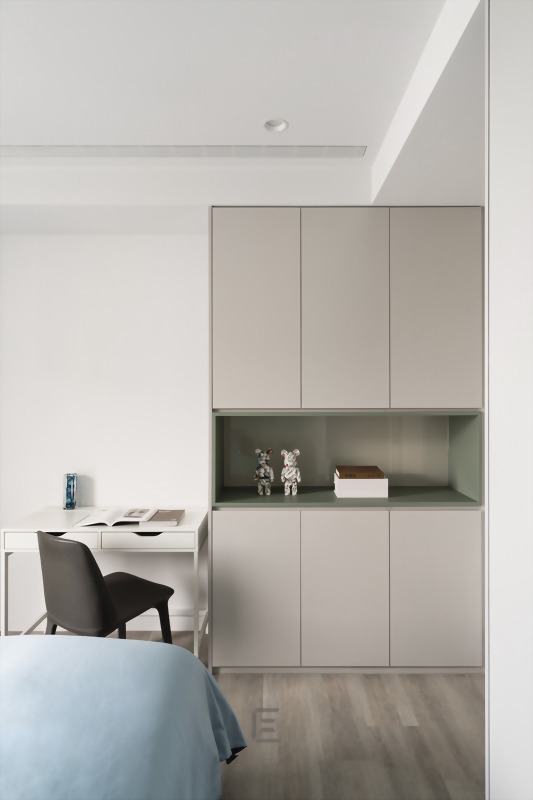 主臥室這個空間,除落地窗那一面因為是採光面所以沒有規劃收納,其餘三面都規劃了收納櫃或抽屜,有效地利用了空間來發揮極致的收納效果。