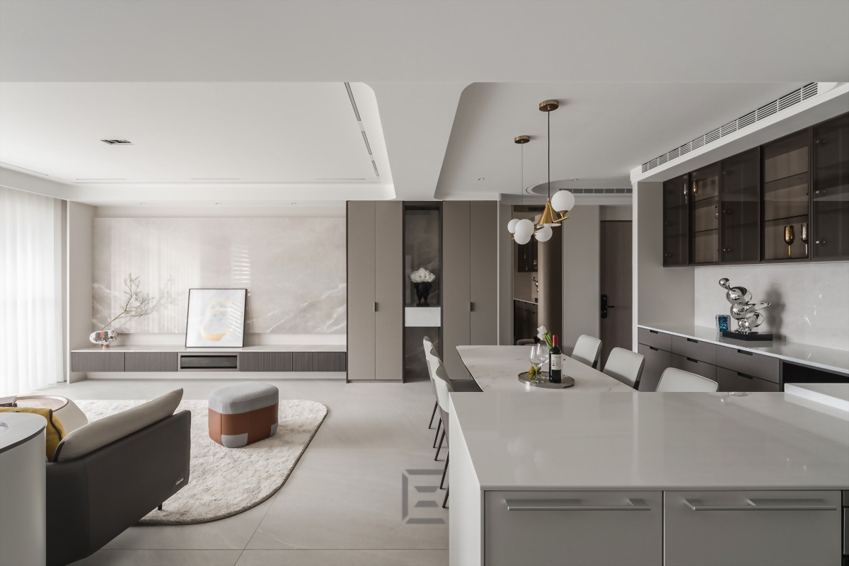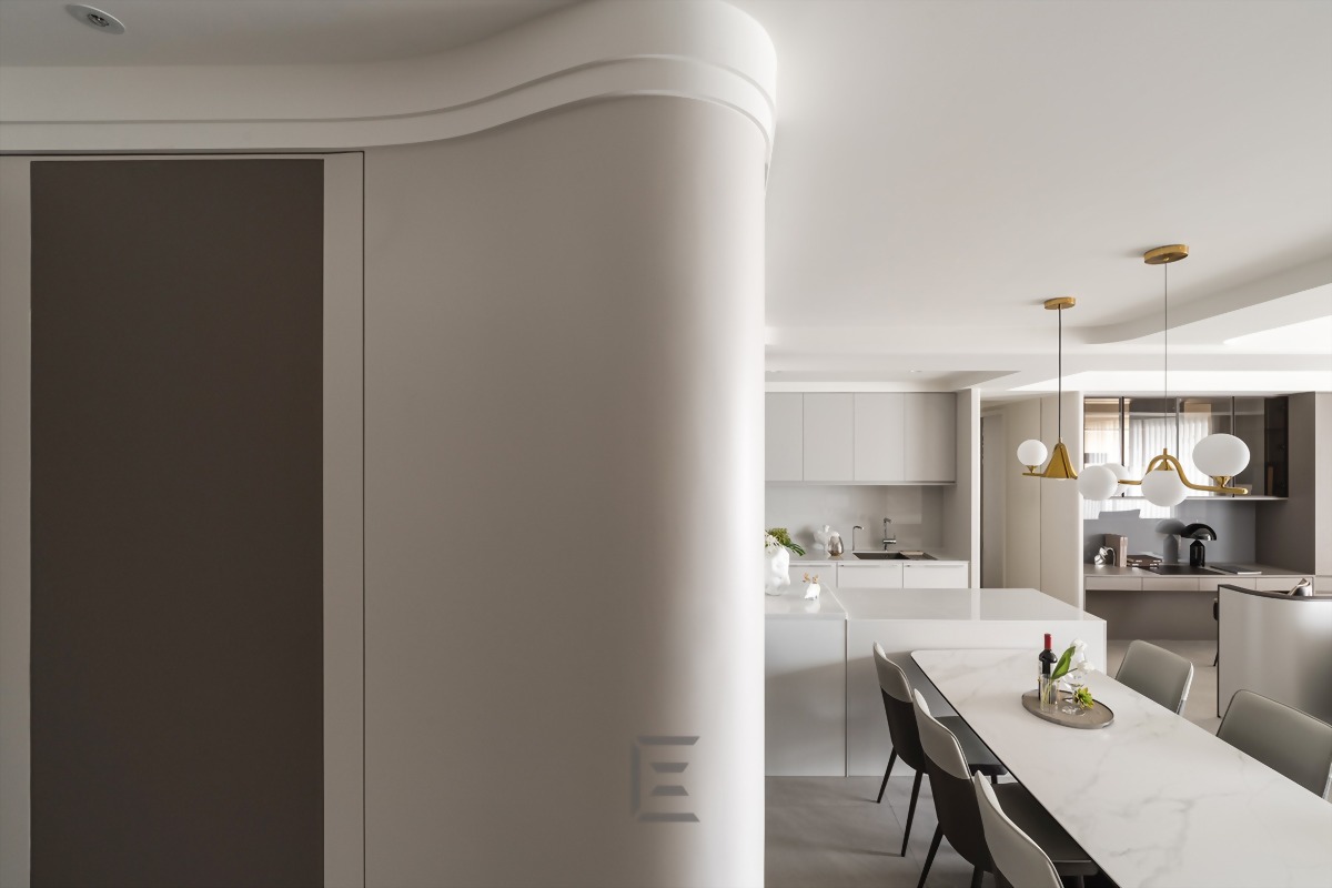 餐廳區域以開放式廚房結合中島和餐桌,讓人感到視覺上的開闊與流暢。