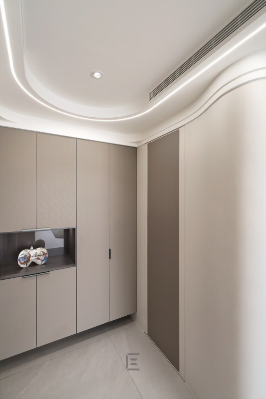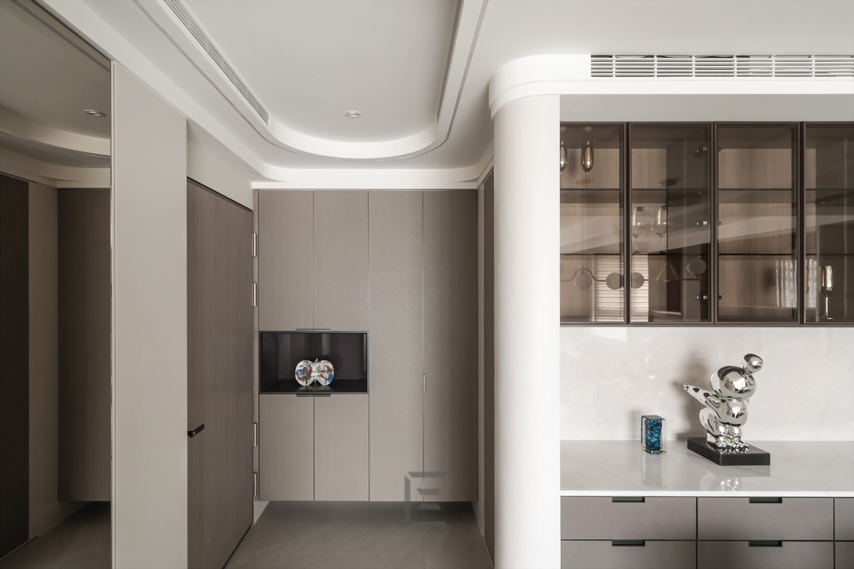 規劃有衣帽間的牆面則以流線弧形來定義,讓空間層次成為玄關的端景。