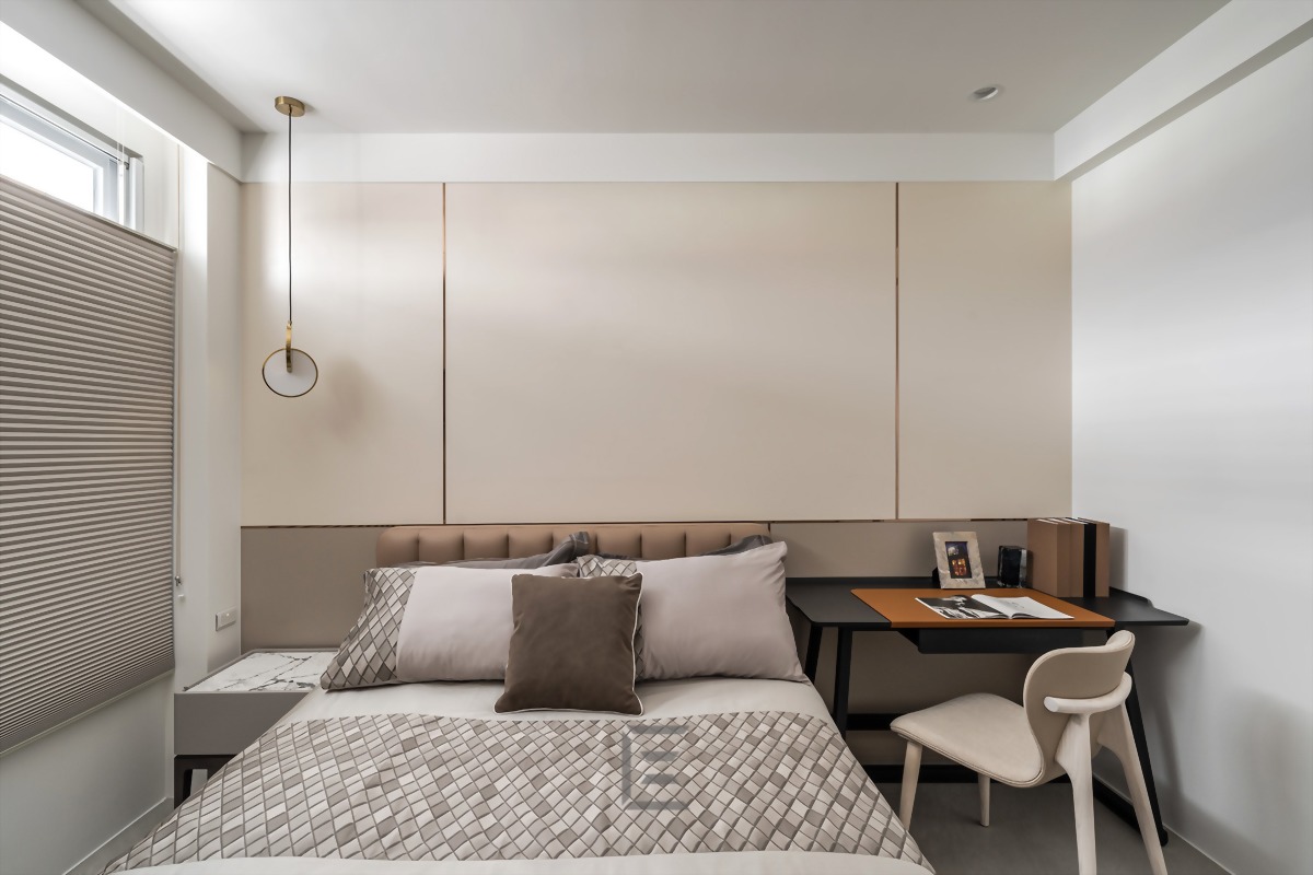 次臥室床頭牆則以簡約金屬條分隔,創造富設計感的幾何圖面。