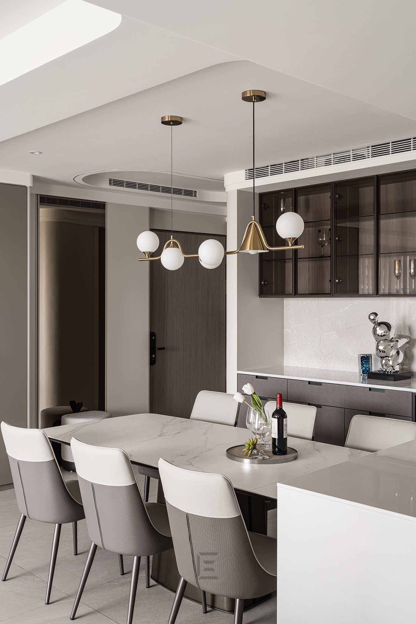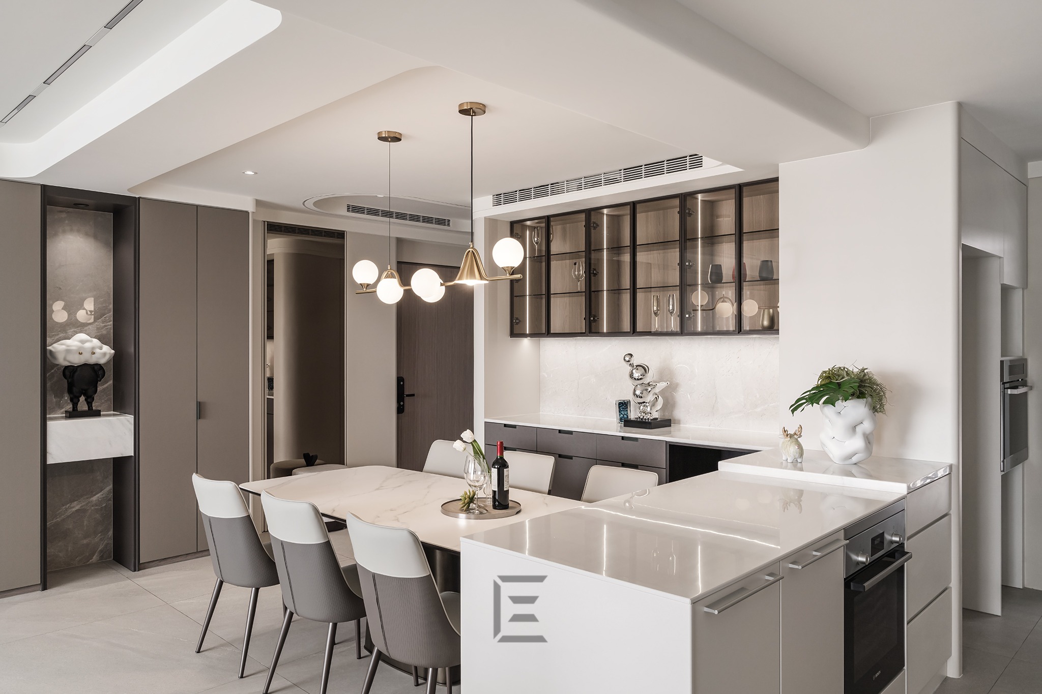 並以牆面整合餐廳收納,吊櫃則利用玻璃材質展示餐具。
