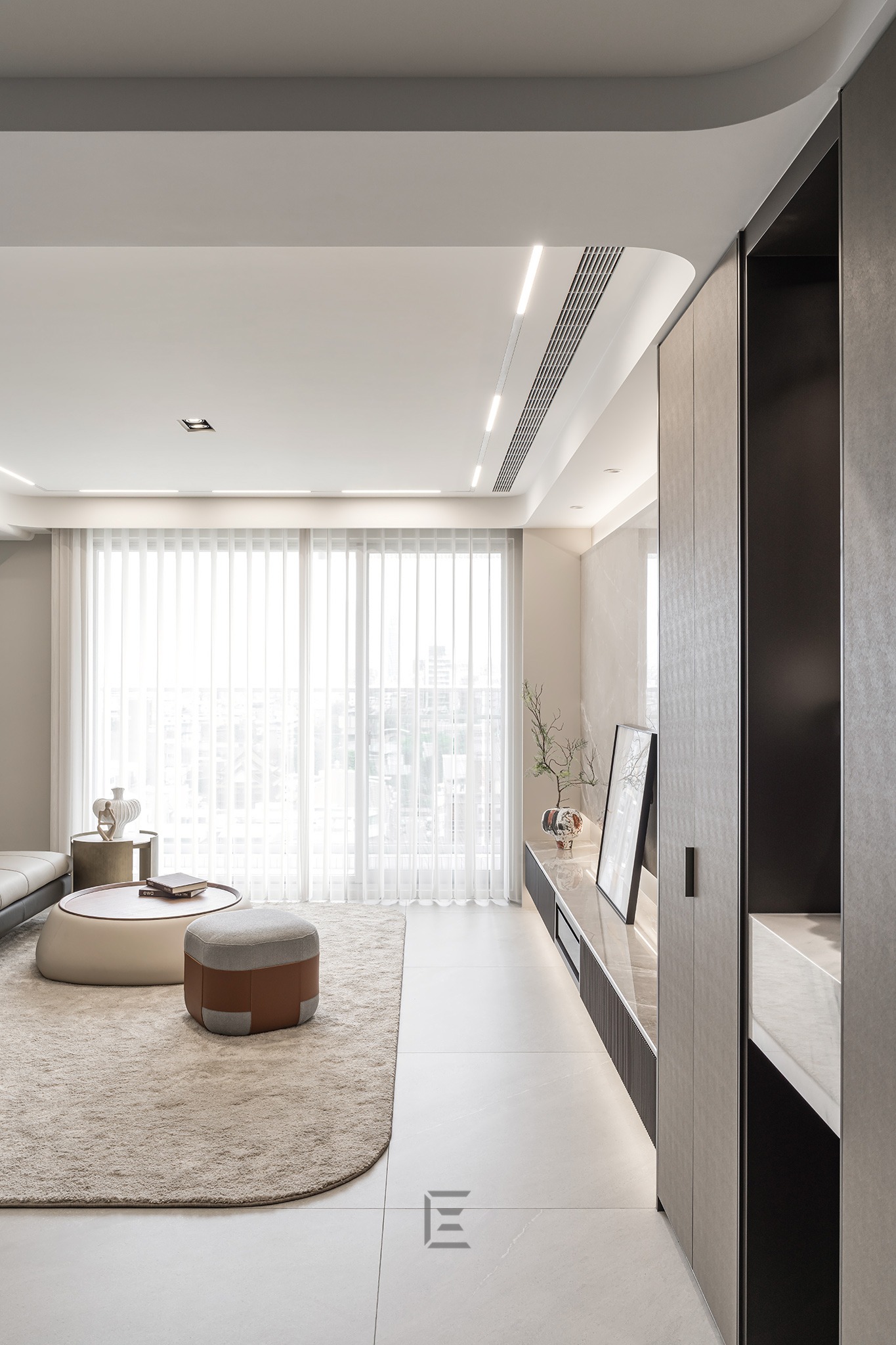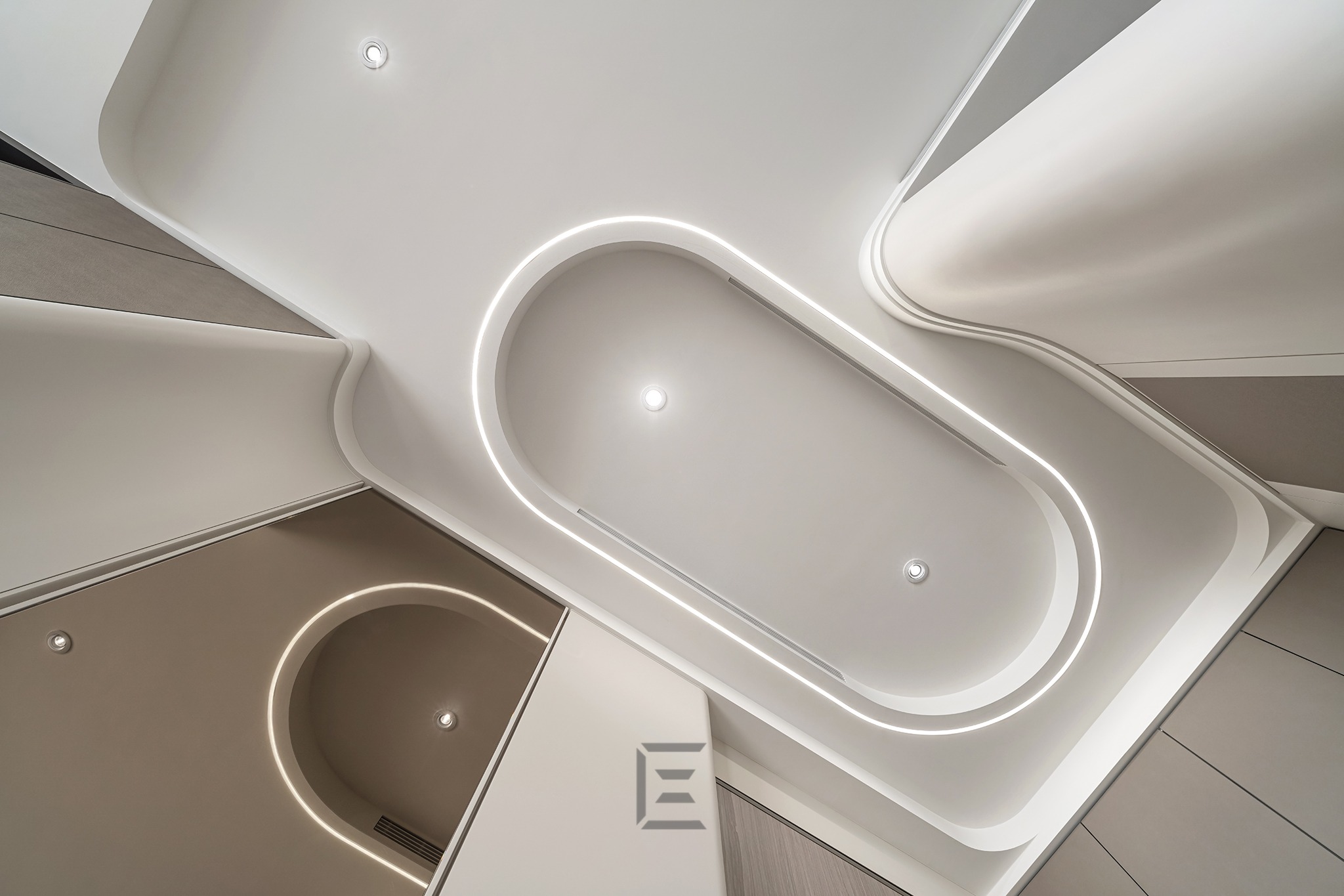 我們在入口處用橢圓形立體天花板來界定玄關,搭配線形燈讓空間變得更生動。