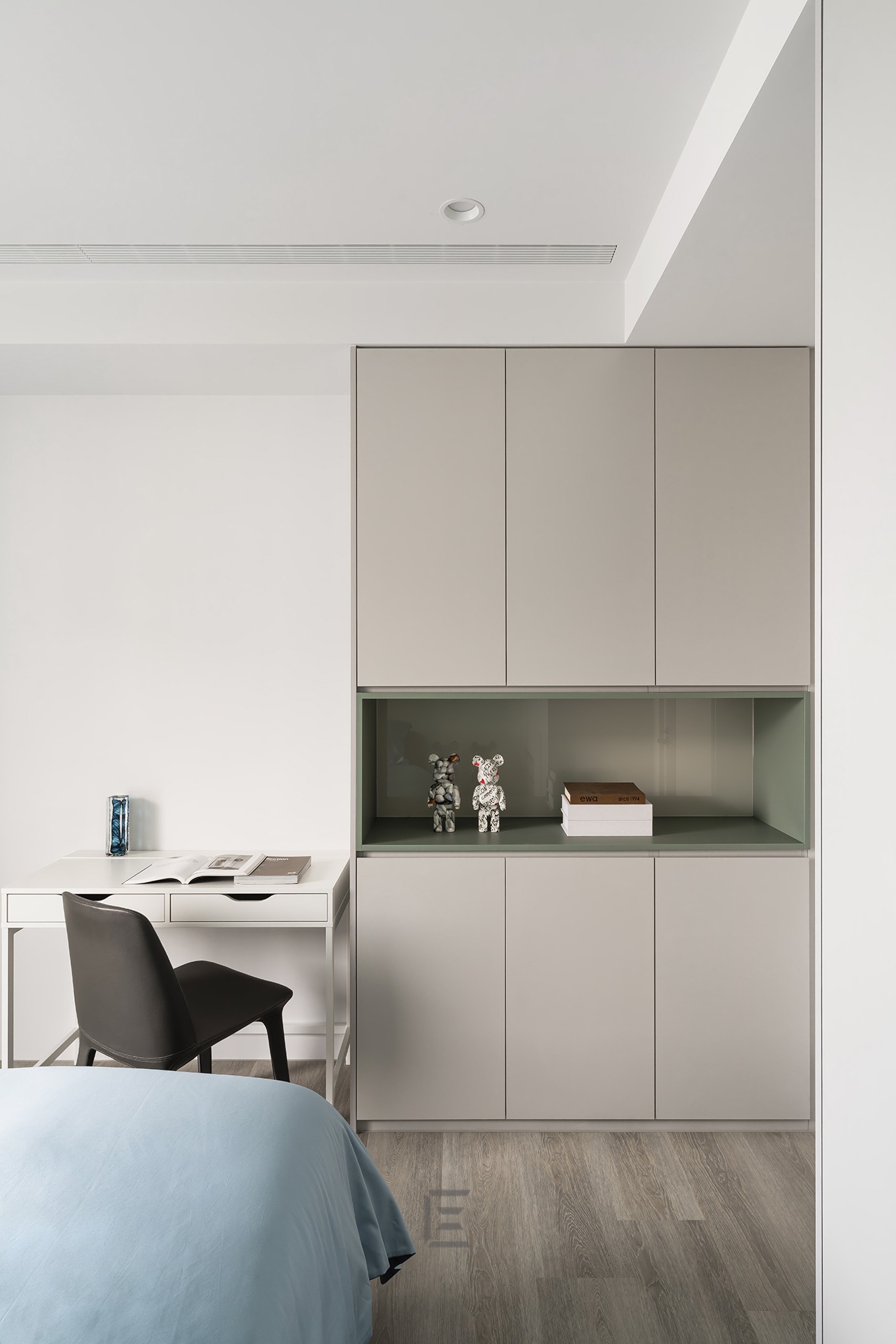主臥室床頭牆因為上方有梁柱,所以設計為具有收納功能的牆面,利用隱藏把手的巧思,化開掀痕跡於無形。