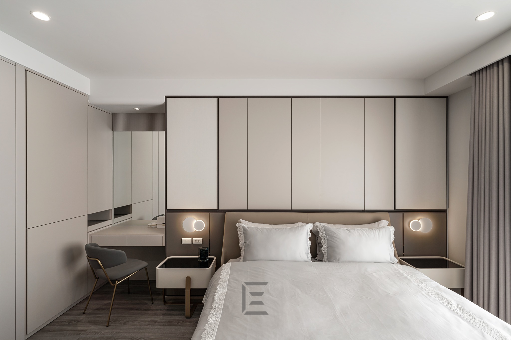我們希望設計出放鬆舒適的氛圍,所以選擇奶茶色為臥室的主調,深色的櫃體則增加空間的對比,形成室內的深淺對白。