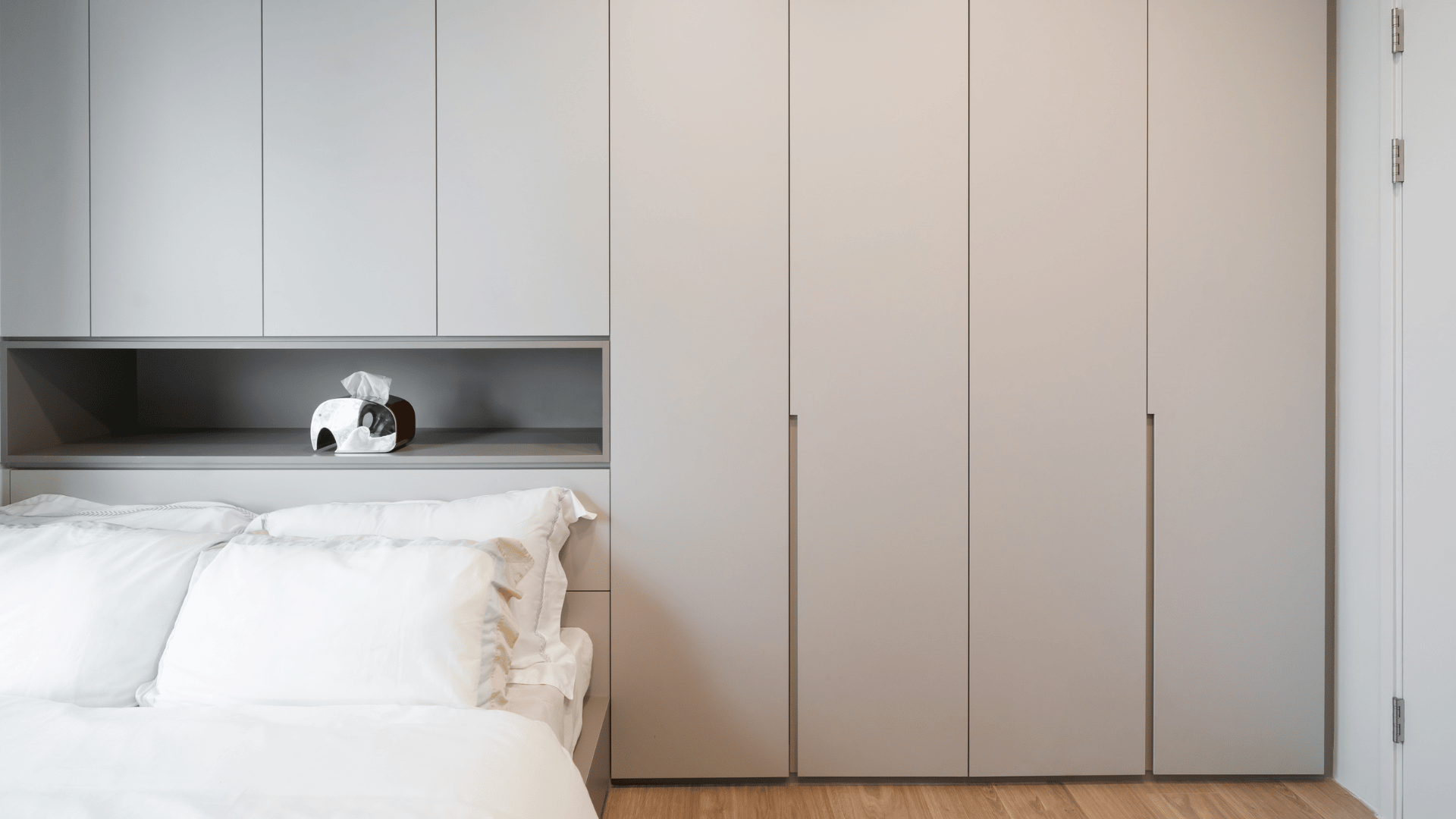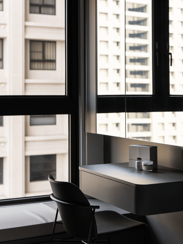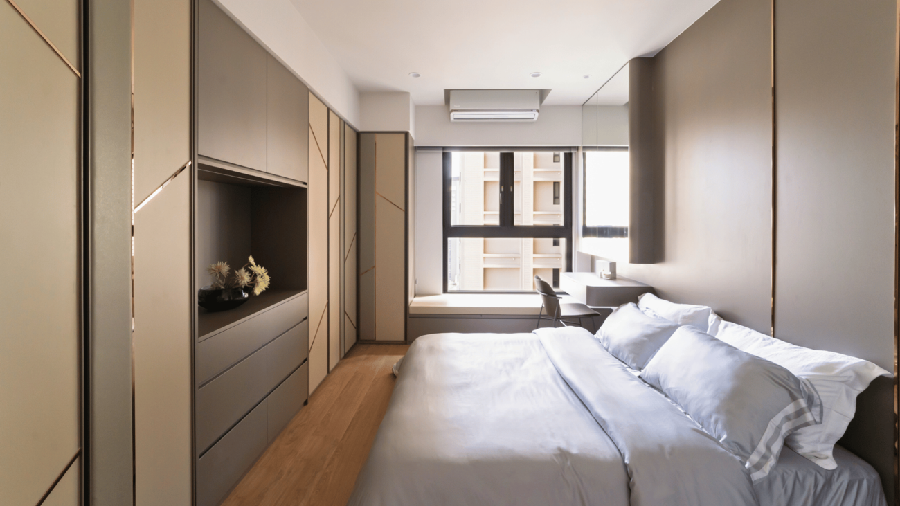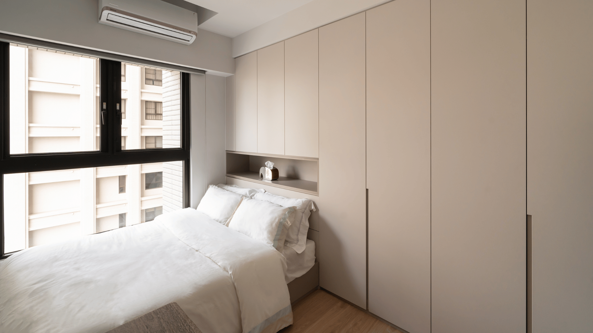 在臥室設計中,團隊始終相信:給予到位的收納,維持房間的乾淨和整齊度,就是讓屋主無後顧之憂好好休息的關鍵;收納系統櫃也多以門片式將收納物品封閉起來。