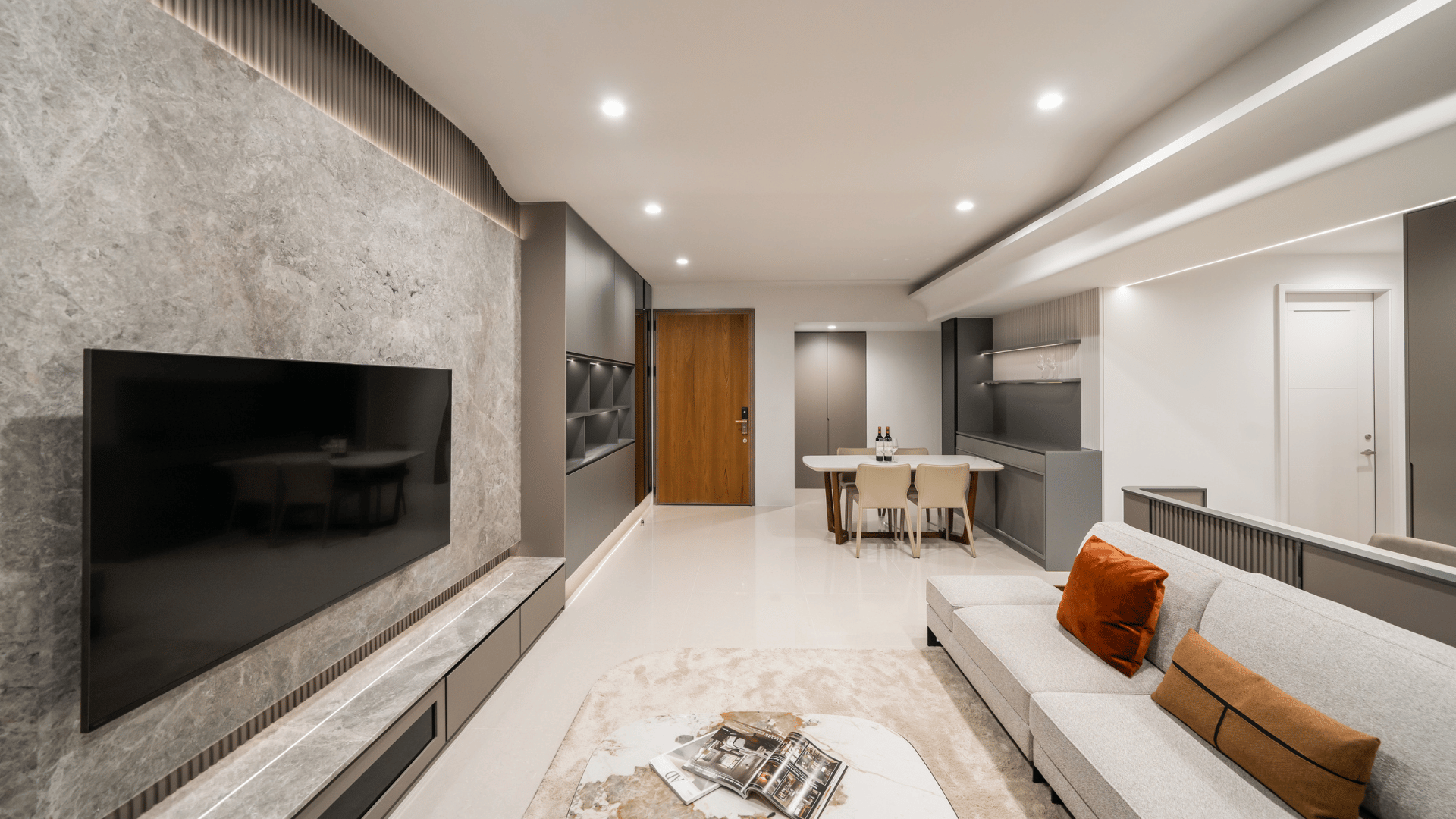 連接著玄關櫃之外,是另一個「色計」的大面積的石紋電視牆,不僅能做出「價值感」,其獨特的石紋紋理看起來有層次感但配在空間中又相當簡單有力。