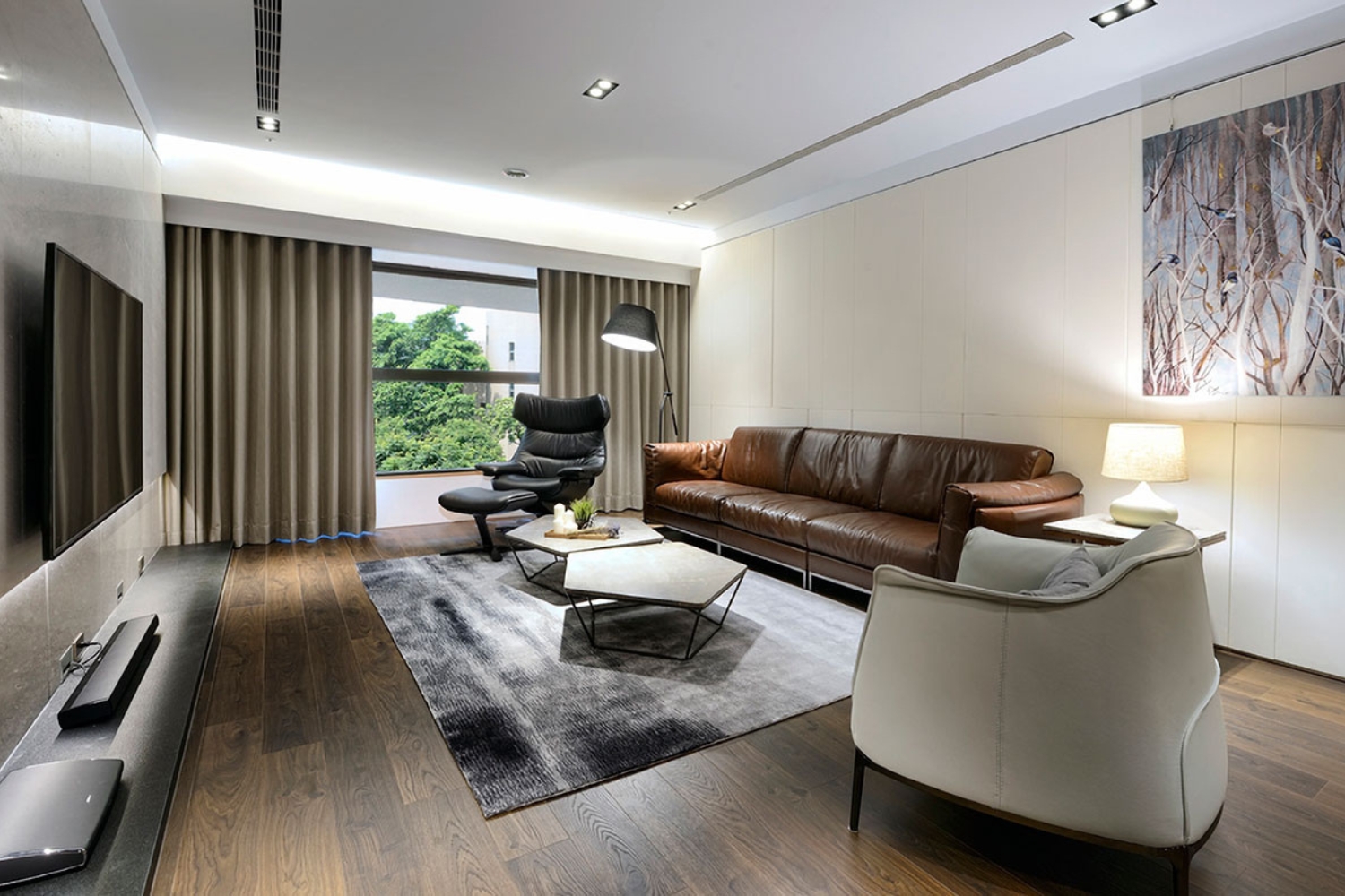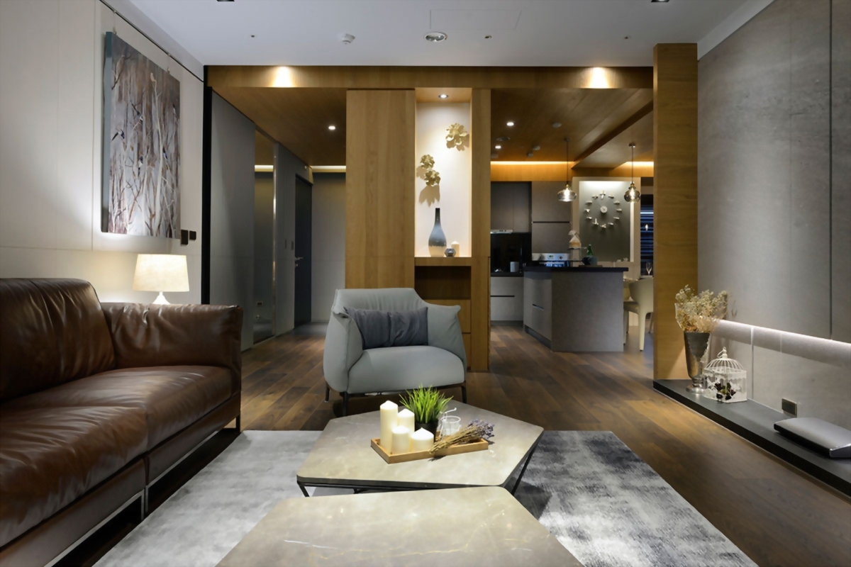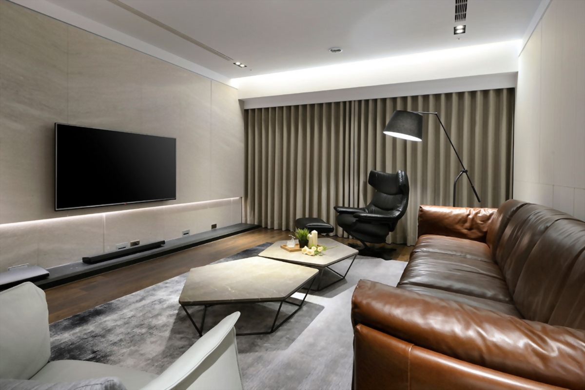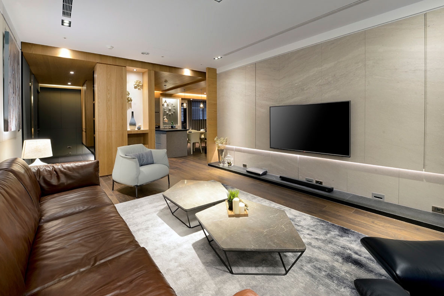 客廳以焦糖皮革沙發與灰階地毯為主軸,搭配幾何石面茶几與線性燈帶,塑造穩定而不失細節的光影語境。電視主牆的石材延展與間接光源層疊,使視覺重心更為沉著,氛圍溫潤卻不厚重。