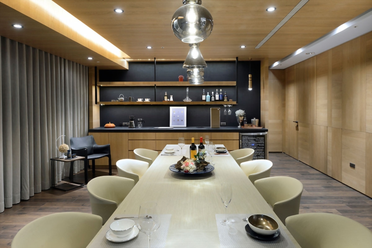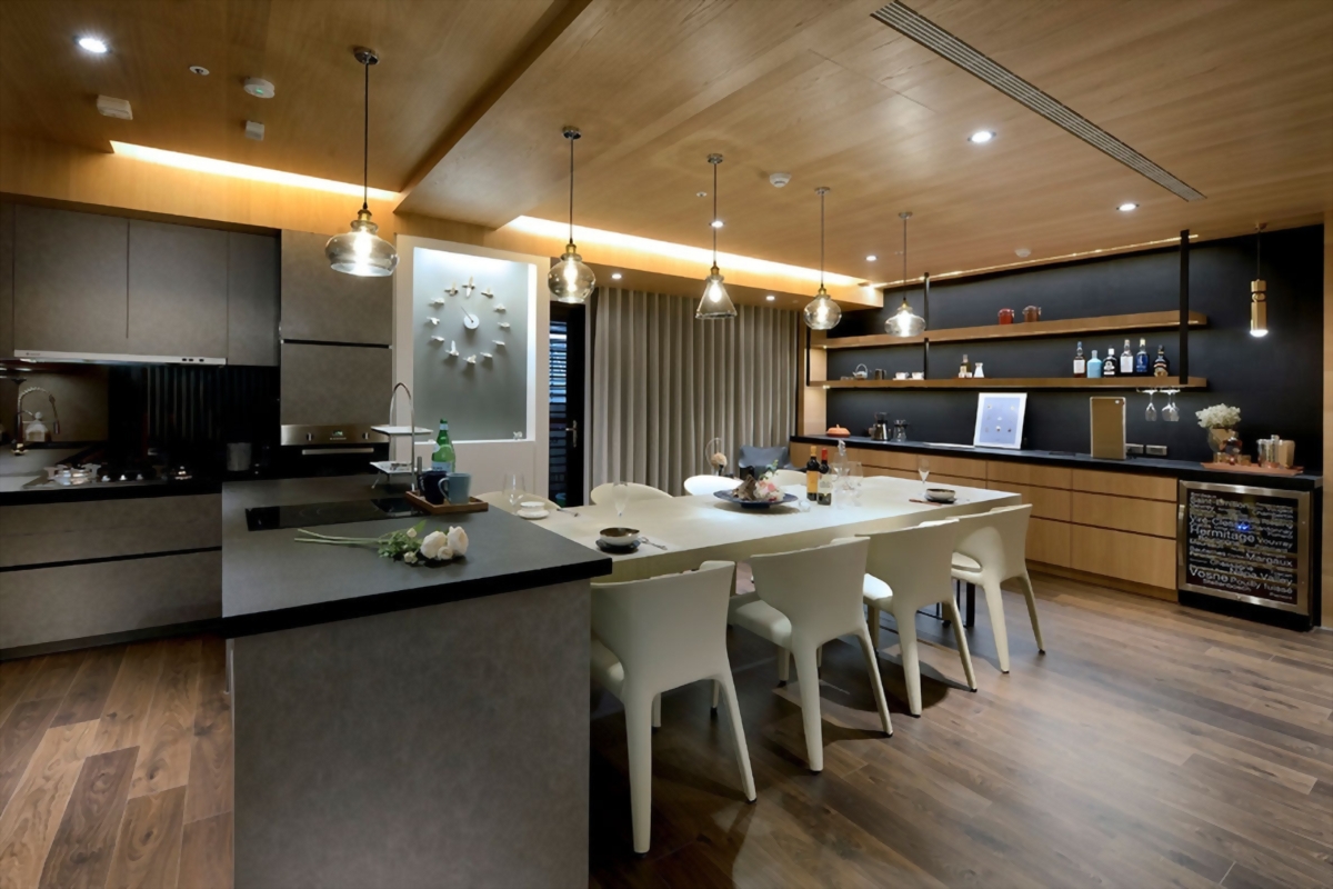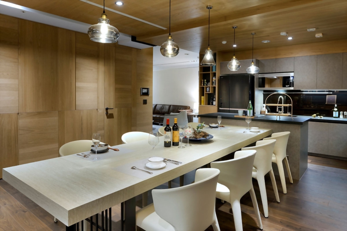 整體以開放式動線規劃,將廚房、餐桌與客廳連成生活的核心軸線。長餐桌延伸視覺重心,讓料理、用餐與交流自然交融;層次分明的吊燈與光影投射,構築出空間的節奏與層次感。