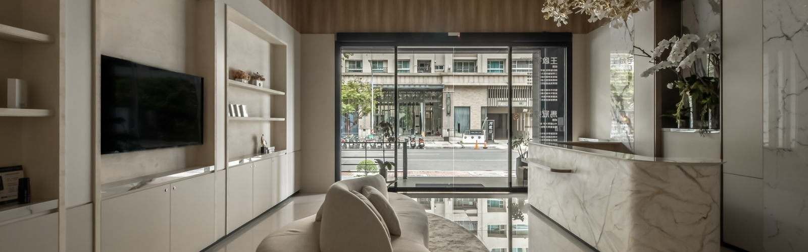 以白色、米色以及石紋搭配而成的接待櫃枱,與燈光效果互相搭配呈現若隱若現的柔和燈光之美。