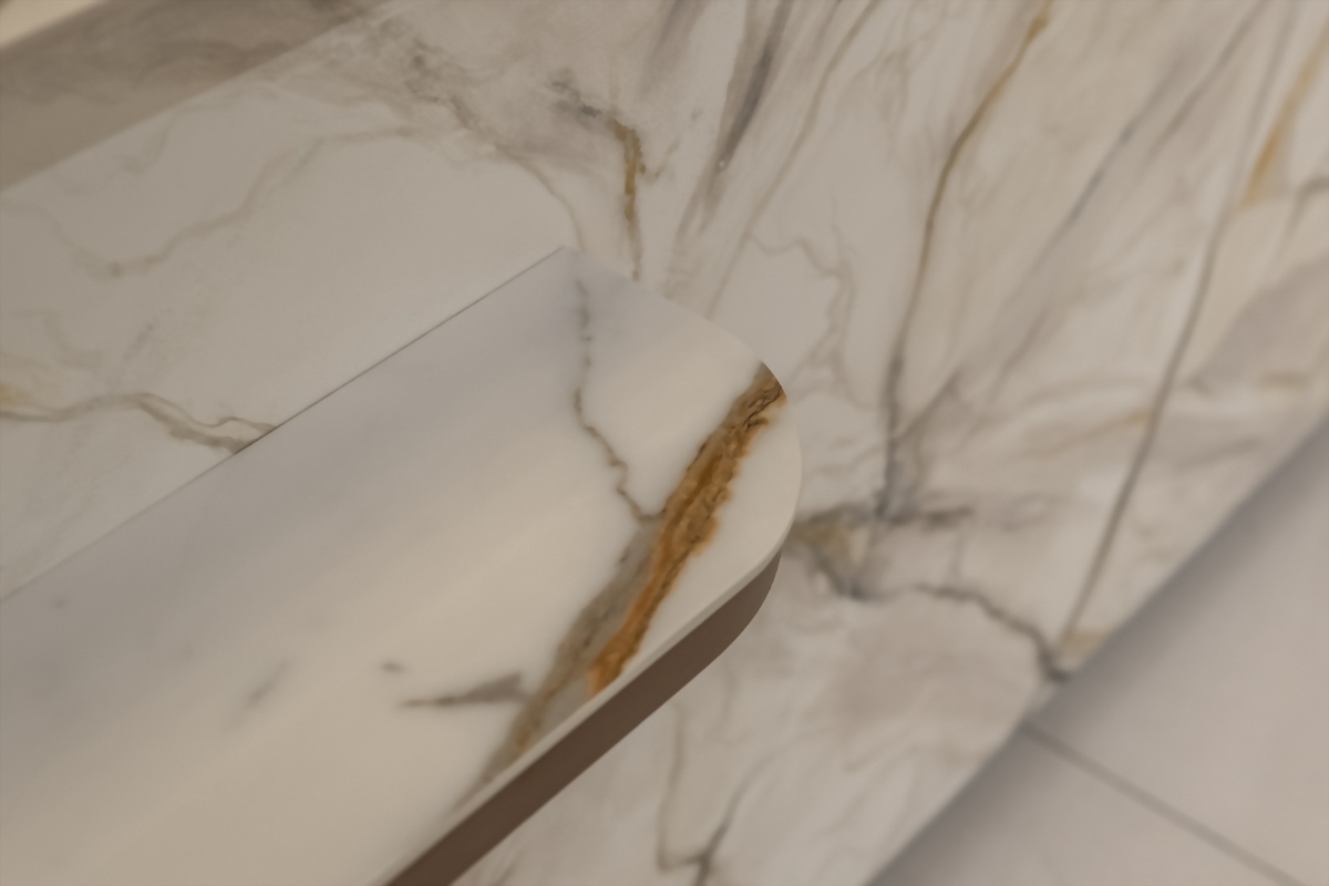 除了手繪的石紋手工漆,在櫃枱處還有很多「小心機」。櫃枱前方有個貼心的「小平台設計」,客人可以暫放物品,不必再把用品或是心愛的包包放在地上。小平台的設計上也特地使用了金屬漆增添現代質感。