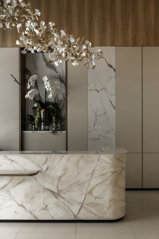 而在木紋以外的空間設計,則是以淺色系統板材為主,迎賓報到的石紋櫃枱很不簡單,使用的並不是石材或是石紋大板磚,而是以「手工特殊漆」繪製而成。不管是石材或是板磚,在圓弧設計上本身就有限制,而利用特殊漆,就可以解決這樣的難題。