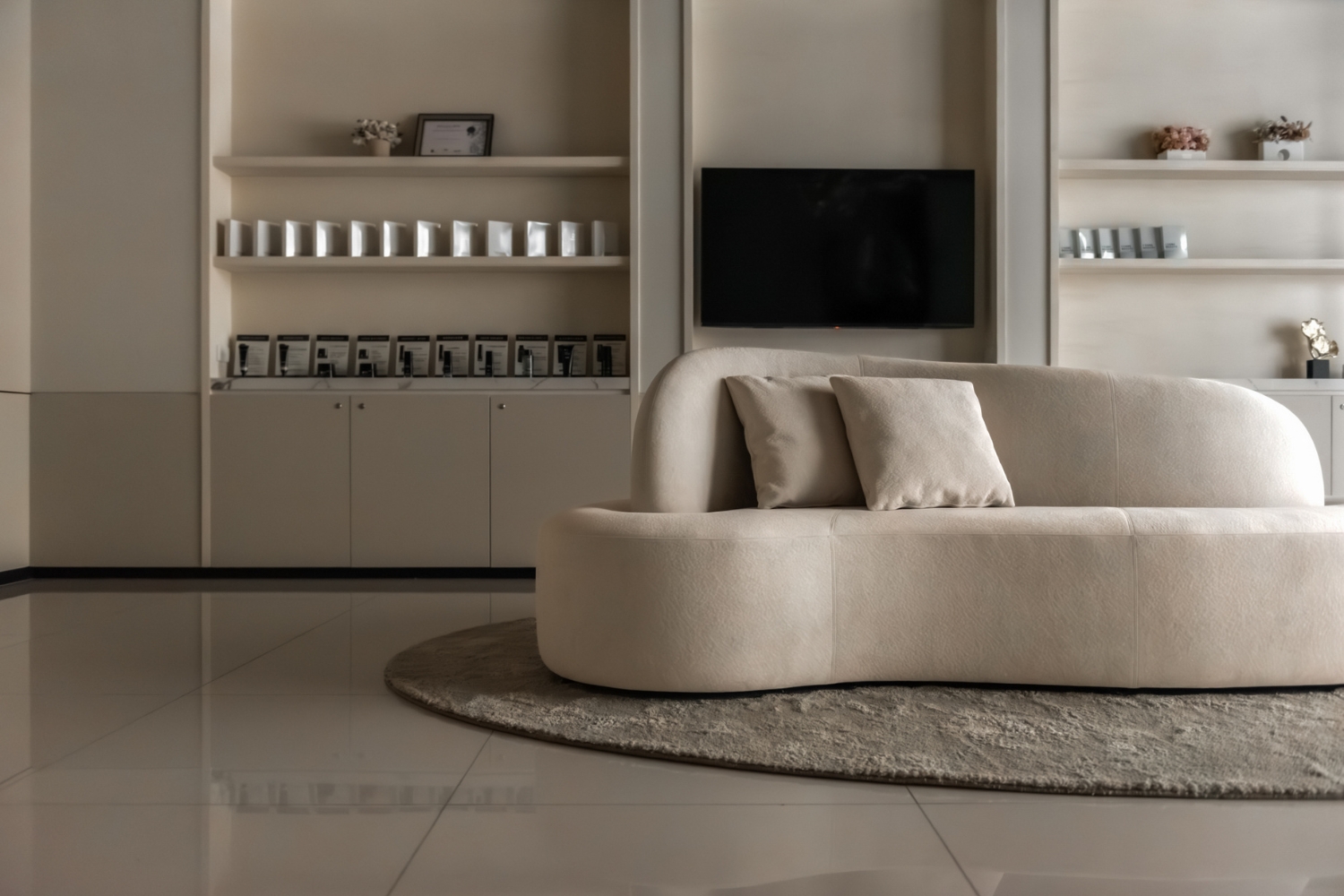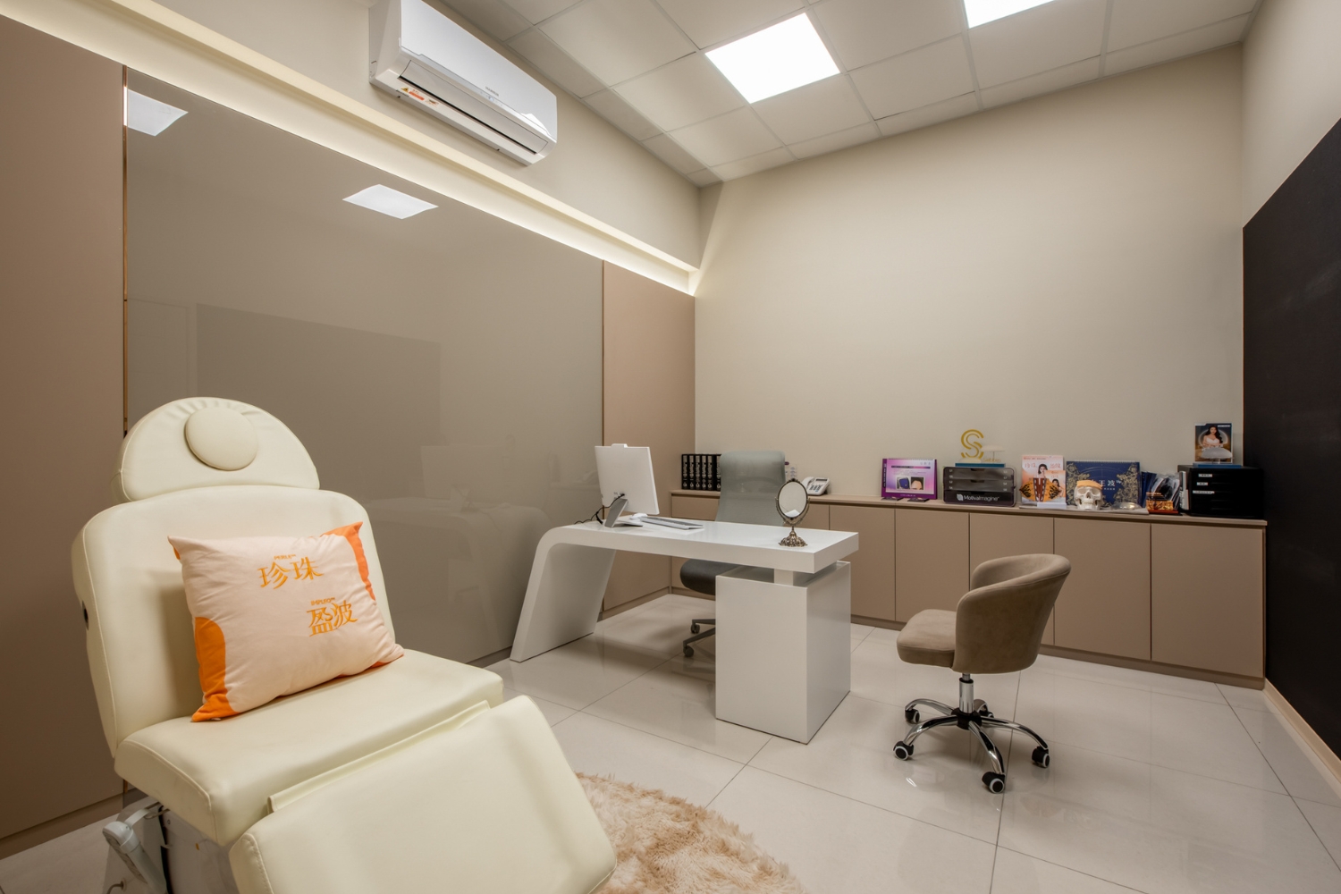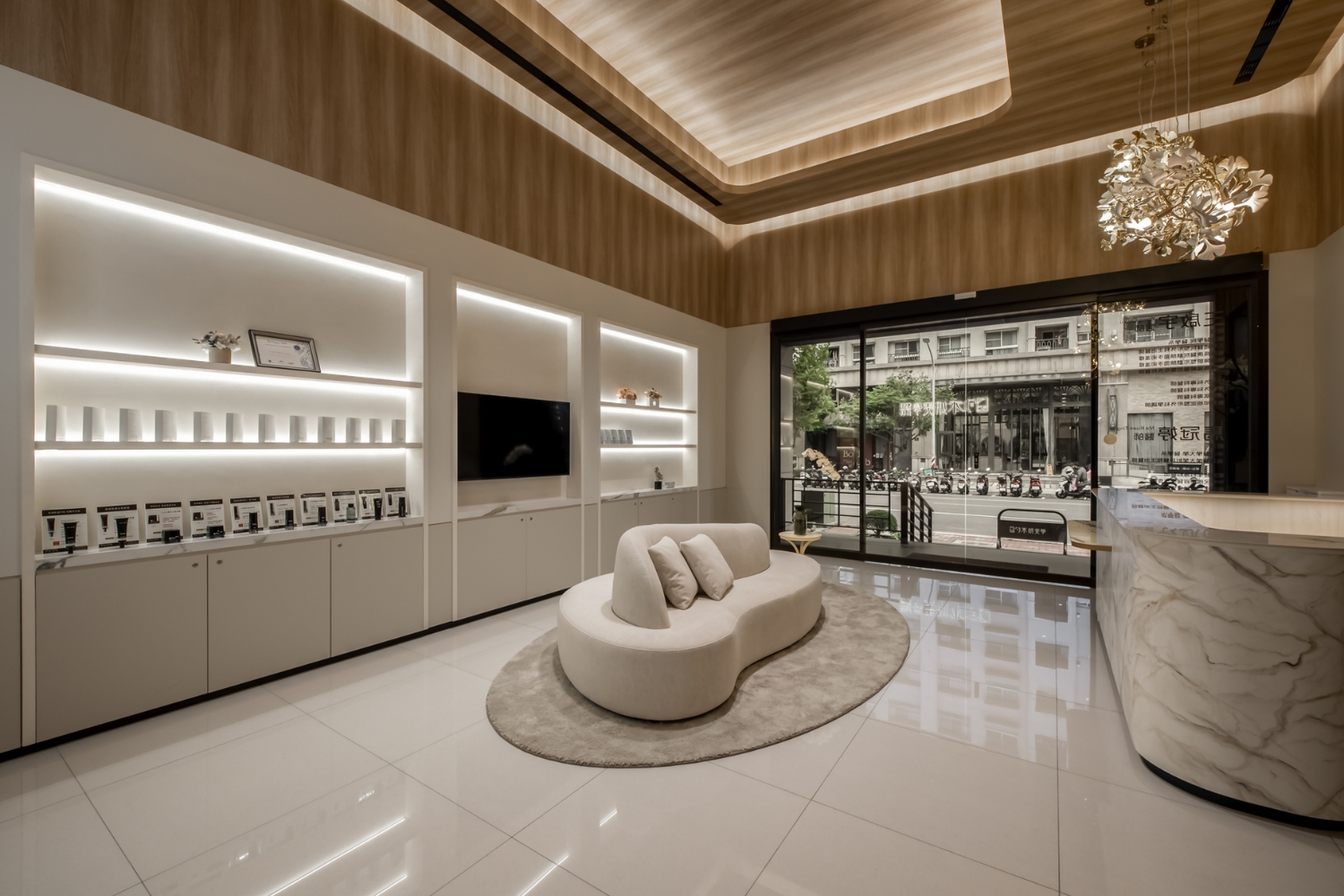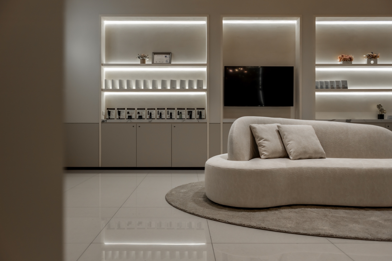 為了不讓必要存在的雜物破壞此時此刻的優雅,收納以及適度的展示將是必要的加分項。醫美診所設計中,商業取向的展示少不了,但如何能在美感與商業之間取得平衡,決定了患者能給這裡幾分的好感度。