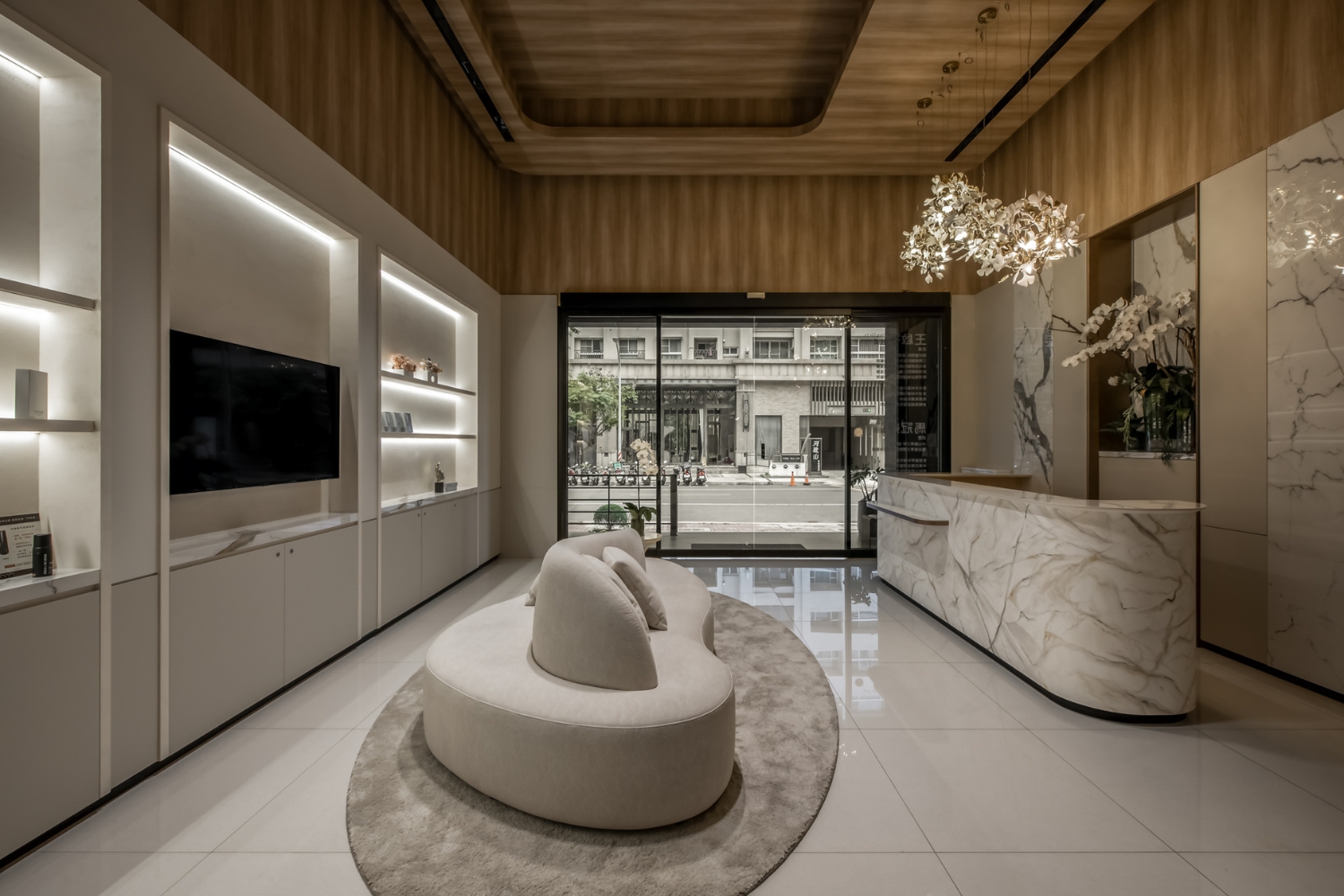 迎賓等候大廳面向櫃枱的另一邊,設計相對簡雅卻不失美感,空間中很難人人都成為主角,而正是這些樸實無華的存在,更成就了精雕細節的難能可貴。在大廳中間,先安排上一張素色的造型沙發,居中不佔空間的設計,左右都流暢不擁擠的圓環型動線很加分。靠牆的部份,則是以木工櫃架與系統合一的模式,集「展示」、「電視牆」以及「收納系統櫃」三者於一體。平層展示台,僅以淺層25cm最剛好的展示層架深度,在可視角之內可放置商品、證照、最新消息等文宣,方便人們一眼就能獲得最重要的訊息。大板磚的石紋枱面加上內坎的燈條,用間接光源打造診所的溫柔感,即便是就診,仍能感受無比舒適。